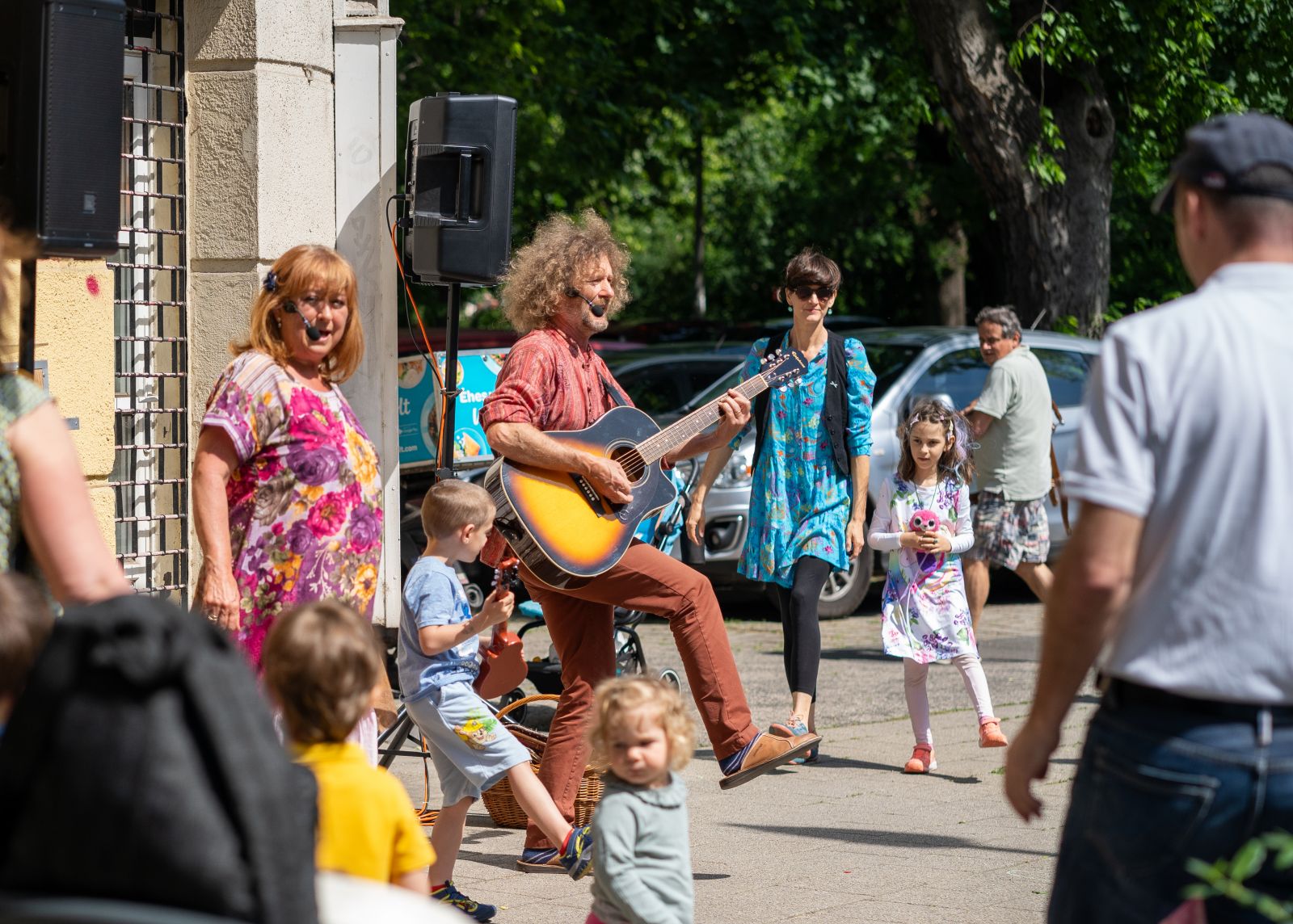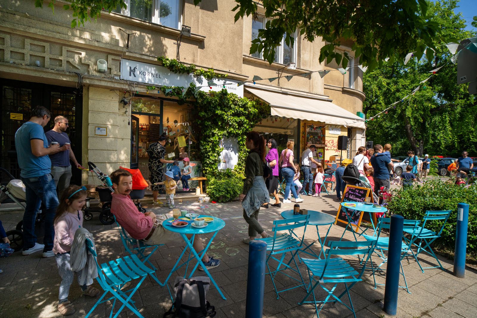A napot a Kornélban kezdtük egy remek reggelivel, ahol a kávézás élményéhez vizuális élmény is jár: az apró üzletben mindig van valamilyen képzőművészeti kiállítás, és a falakon, polcokon bábok, papírszínházak, printek, noteszek, képeskönyvek sorakoznak, sok izgalmas hazai alkotó, illusztrátor termékéből lehet vásárolni. Az árnyas, hangulatos terasszal rendelkező kávézó előtt közben már elkezdődött a Zenekuckó zenés-táncos élményteremtő gyermekprogramja gitárral, furulyával, a legkisebbek lelkesen vesznek részt a közös játékban.