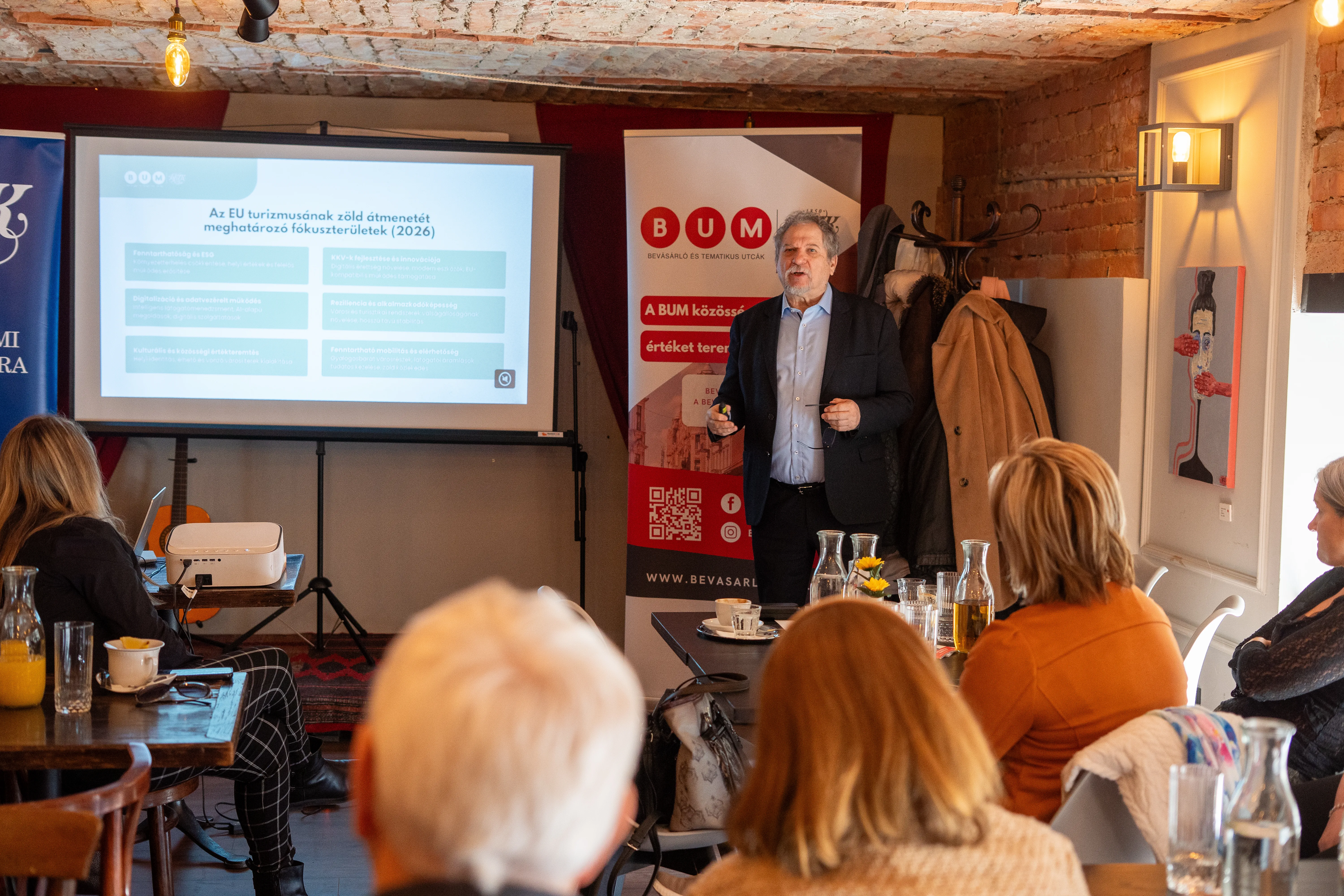 Idei első BUM Üzleti Reggelinket 2026. március 3-án tartottuk, ahol a fenntarthatóság különböző üzleti és városi vonatkozásai kerültek a középpontba. Az eseményen több területről érkező szakmai előadók mutatták be, hogy a fenntartható működés miként jelenhet meg a a kulturális programok szervezésében, városi turizmusban, a kommunikációban és a gasztro szemléletben, vendéglátásban. Köszönjük a helyszínt a Margaux Kávézónak!
