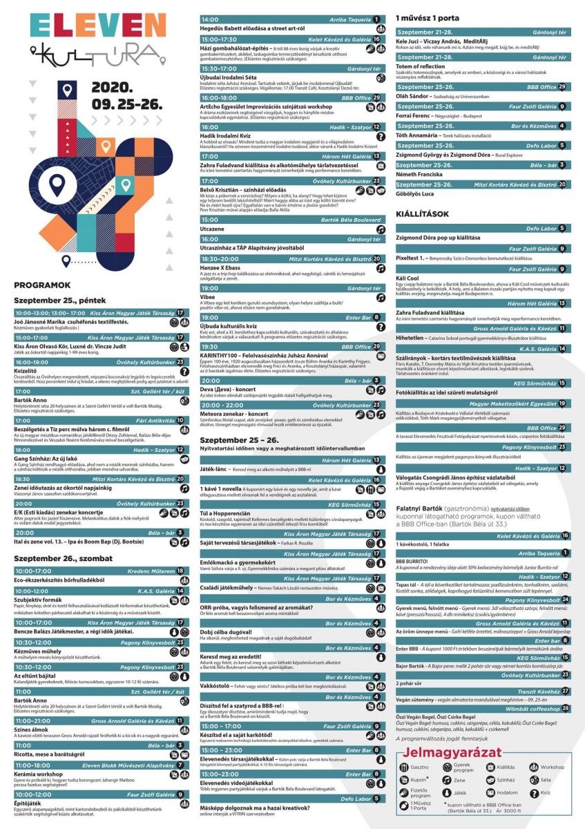 Az ELEVEN ŐSZ keretében a sokszínű helyi vállalkozások, izgalmas művészeti programot kínáló galériák, az ínycsiklandozó falatokat felszolgáló éttermek, a hangulatos borozók és kávézók forgalmas utcából igazi közösséggé varázsolják a Bartók Béla Boulevardot. Teszik mindezt a hely szelleméhez méltón, hiszen ne feledjük, hogy egykoron olyan nagy nevek, mint Kosztolányi vagy Karinthy is itt töltötték szabadidejüket, itt merítettek ihletet az alkotáshoz. Azóta indultak már innen új irányokat mutató irodalmi programok, vagy éppen határokon átívelő kiállítások, és ma már a hangulatos nyári esték is nehezen elképzelhetők a Bartók Béla nyüzsgő forgataga nélkül.