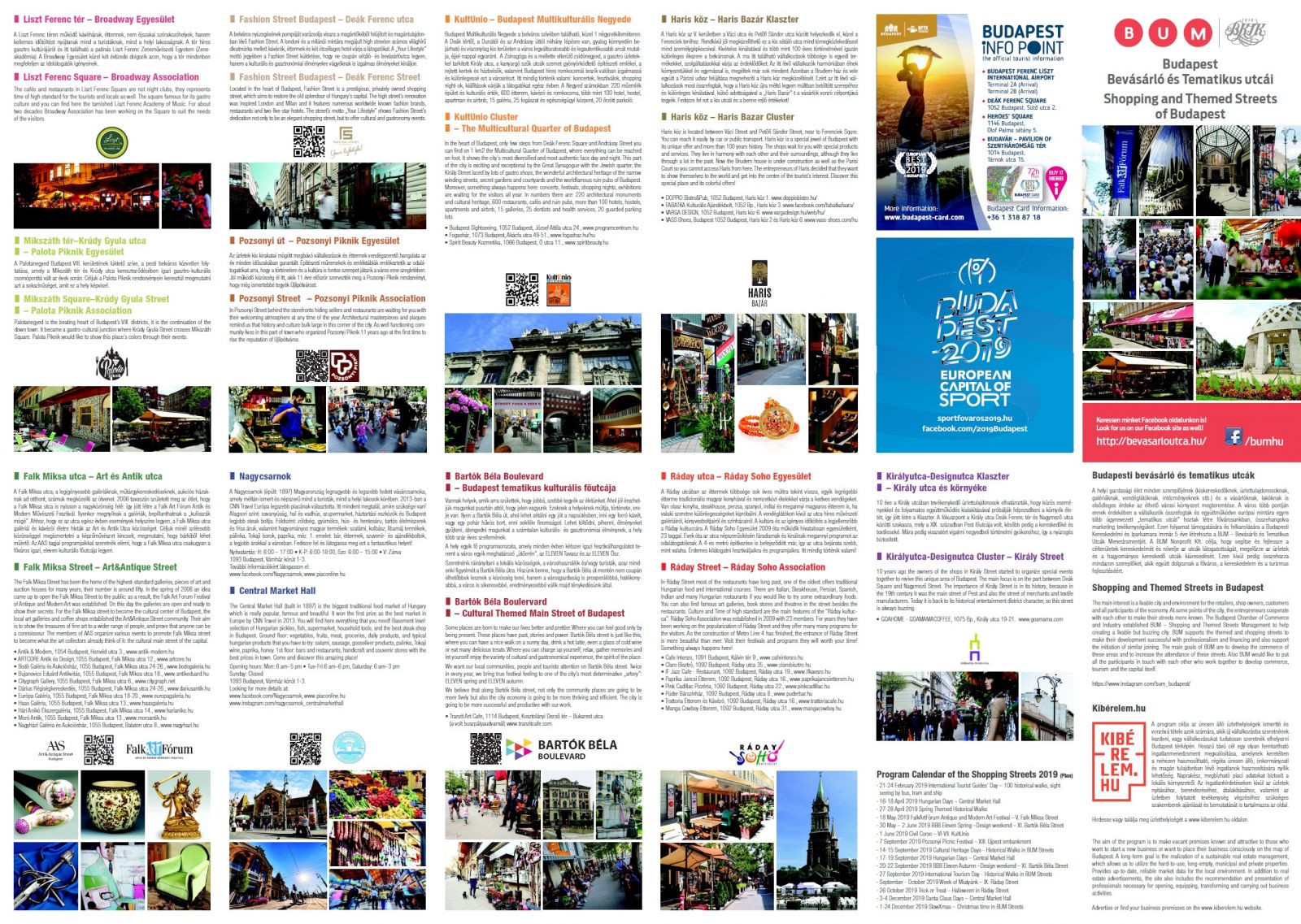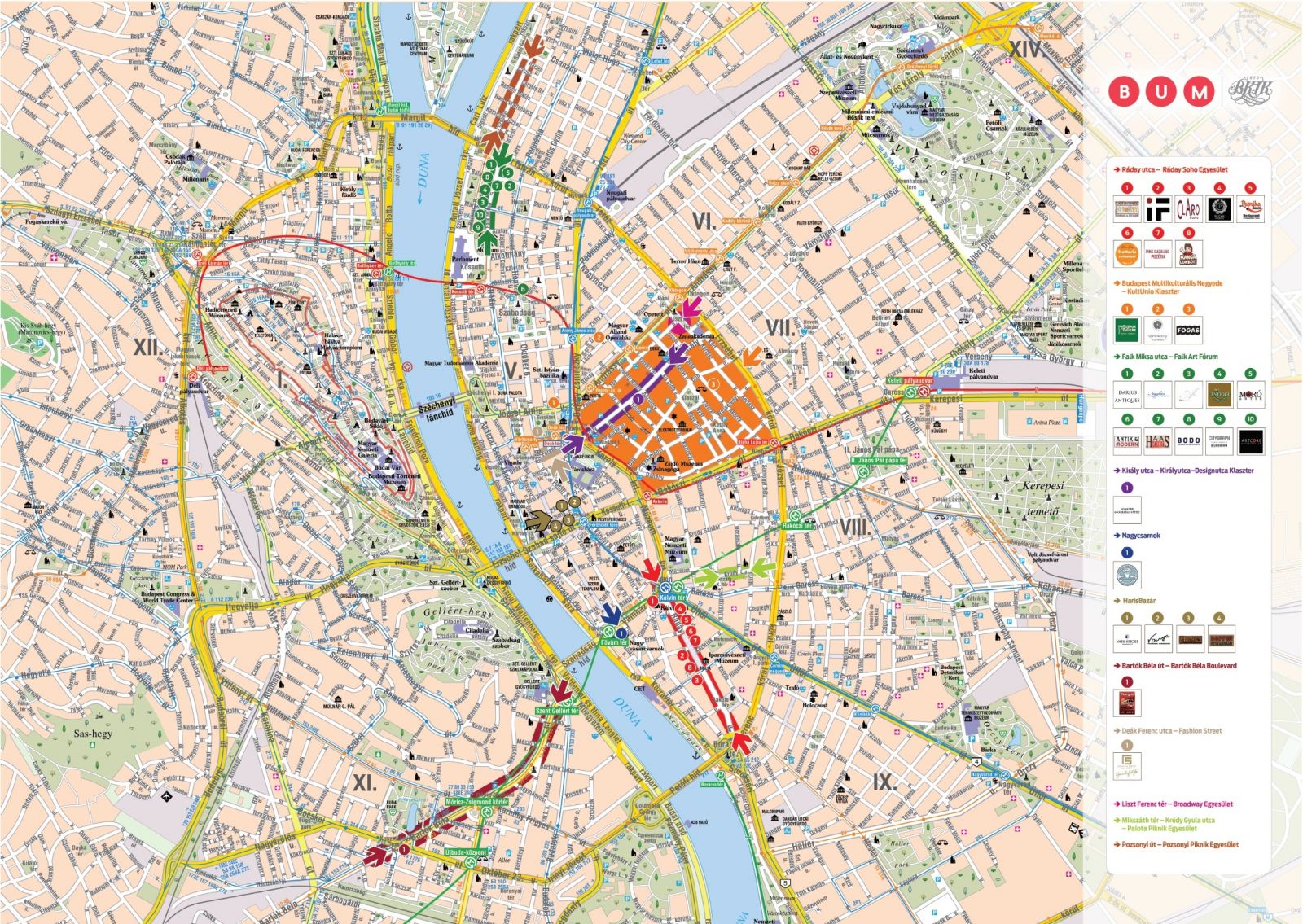 A tematikus utcák népszerűsítésére és az idelátogató turisták számára mintegy alternatív program lehetőséget kínálva született meg a BUM térkép. Közel 1,2 millió példányban jelent meg ez az ingyenes kiadvány eddig. Az egyik oldalon Budapest térkép jelenik meg, másik oldalon pedig a leírások és tájékoztatók szerepelnek, mind az utcákról, mind az adott évi eseményekről. A térképek terjesztésében a Budapesti Fesztivál és Turisztikai Központ a fő partnerünk, így mind a budapest infó pontokon, mind kiemelt rendezvényeken is megjelenik a kiadvány. Partnerünk a terjesztésben az Aranykulcsos Szállodaportások Egyesülete, akik 4 és 5 csillagos szállodákba visznek belőle. Ezenkívül 350 Budapesti display helyre is kikerül (orvosi rendelőkben, autó szalonokban, fitnesztermekben stb.) Természetesen az utcákban a vállalkozásoknál is megtalálhatók majd a kiadványok. Összesen 75.000 példányban nyomtatjuk most a térképet.