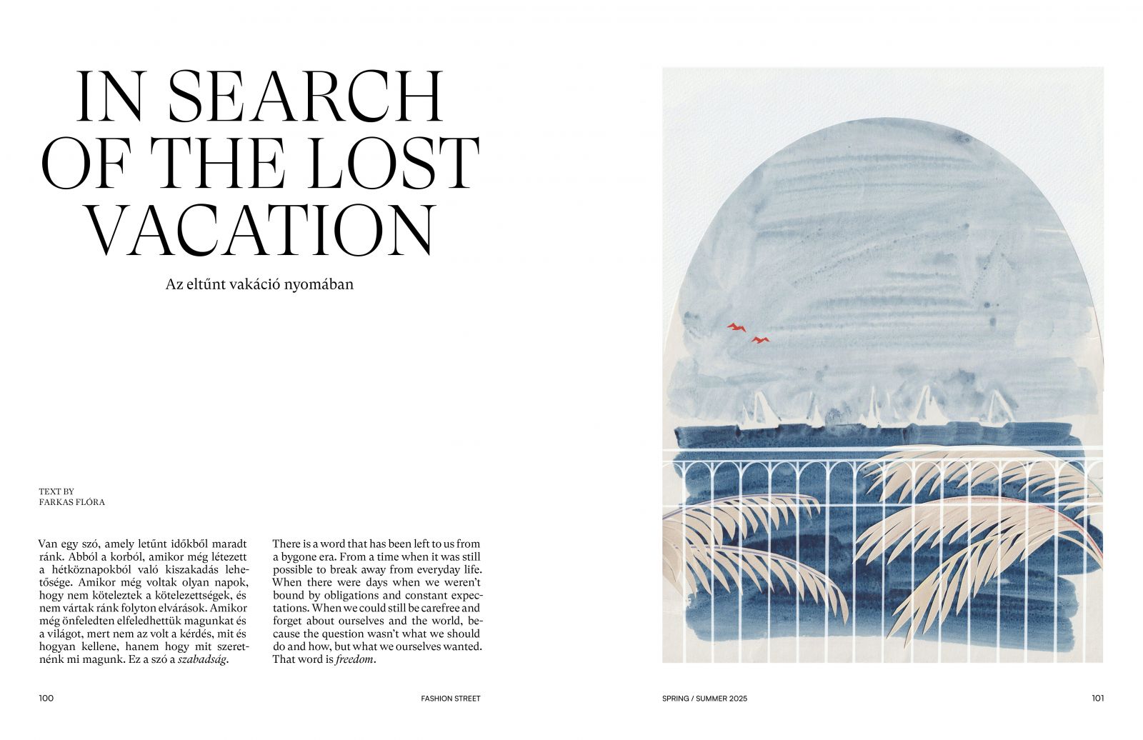 If it's summer, it’s time for quality reading. Flóra Farkas, a holistic transformative coach, wrote about the lost vacations in our overstimulated world. She approaches the concept of freedom from a very exciting perspective and provides concrete tips on how we can make the most of the long-awaited days of the year. Alongside Flóra, the recurring guest author of Fashion Street Magazine, Gyula Obersovszky, also discussed the question of refuge. He sought solutions within the sanctity of family, and his words may be divisive from many perspectives—as readers might have already grown accustomed to from him. On the other hand, the eternal truths in such a difficult topic are truly refreshing. Both pieces are beautifully illustrated by Anett Hajdú.