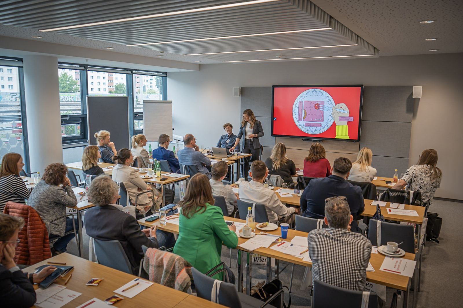 The day began with an exciting joint train ride, as public transport in the city of Vienna is the best way to get from one place to another. One of our old contacts, Kovács Balázs (GD Consulting), awaited us at the station, along with Dora Marta Kovac and Monika Rommer from the WKO Bezirk. They accompanied us to one of the WKO's headquarters near Prater. This is a truly impressive office building where we could hold our presentations in a well-equipped, spacious, bright room. Manfred Sussitz, Claudia Grabner, and Markus Frömmel welcomed us at the venue. Markus Frömmel even personally welcomed the team in Hungarian. After that, the Hungarian side introduced itself briefly.