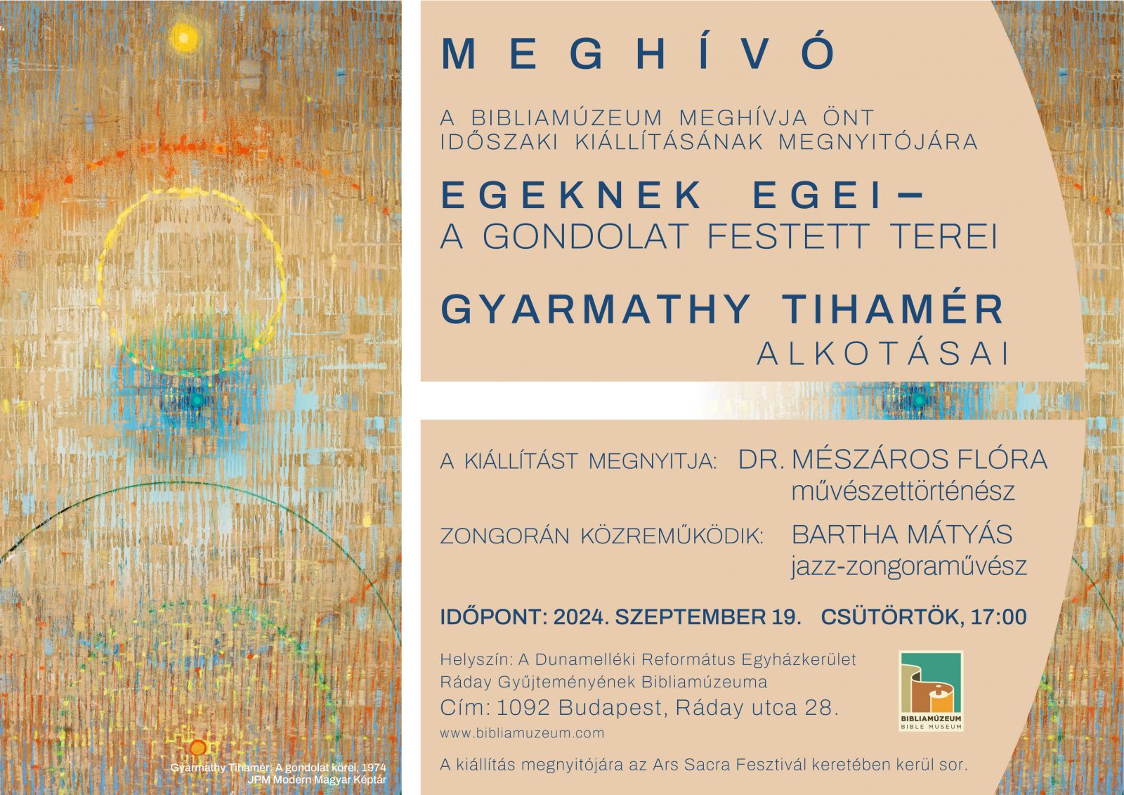 2024. szeptember 19-én nyílik Egeknek egei - A gondolat festett terei címmel a Gyarmathy Tihamér műveiből készített válogatást bemutató időszaki kiállításunk, amely néhány korai, figuratív mű bemutatása mellett főként a művész absztrakt festményeire helyezi a hangsúlyt. A tárlat két szinten több mint félszáz festményt vonultat fel az alkotásban a természet rejtett arcát kutató, a vásznon vibráló, mozgó formák, fények alkotta dinamikát, kozmikus dimenziókba emelt struktúrákat létrehozó festő életművéből. A kapcsolódások szemléltetésére Gyarmathy néhány kortársának egy-két alkotása is látható a kiállításon.
